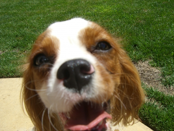 A small, brown and white spaniel-type dog with a pinl spot on each side of his nose.