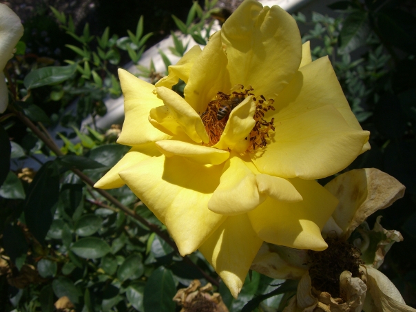 A beautiful yellow flower blooms and shows off its many delicate layers, contrasted against green leaves.