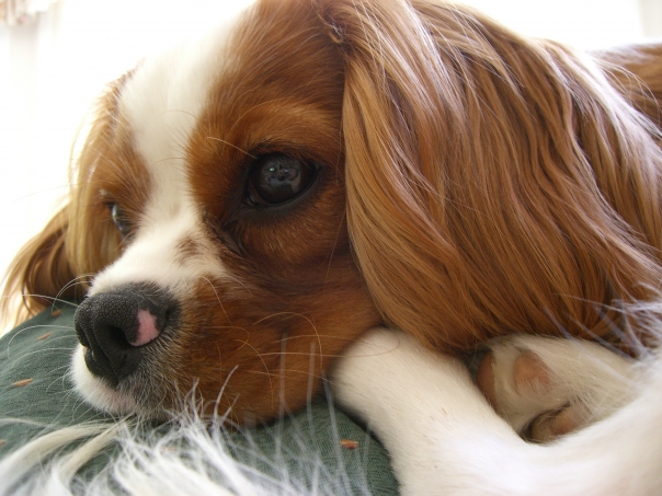 brown and white dog with a pink dot onit's nose