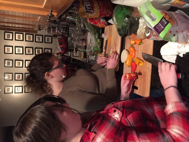 Two woman prepare a meal in the kitchen by cutting up peppers.