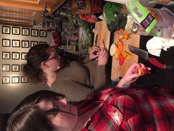 Two women in a kitchen, chopping vegetables, to prepare a meal.