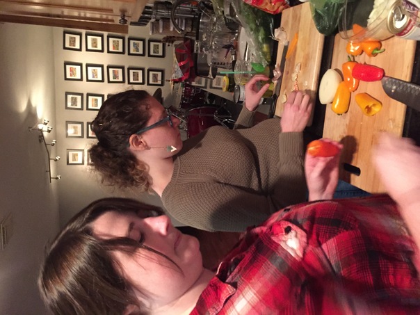 A couple of young women standing side by side as they prepare food.