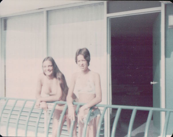 Two girls are standing near a railing while wearing bathing suits in sunny weather.