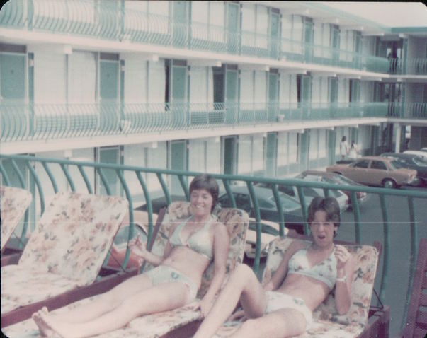 This photo shows two women sunbathing in bikinis at a motel in front of a green railing with older cars in the parking lot below.