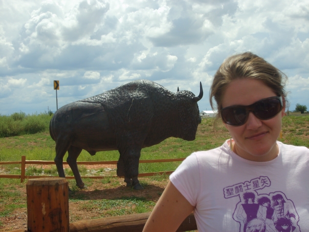 A woman wearing sunglasses is posing for a photo in front of a fence outside with a large buffalo sculpture in the background.