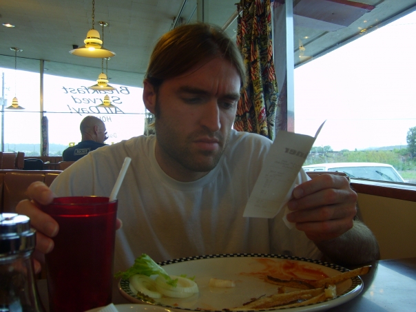 A man with long hair pulled into a ponytail sits in a diner next to a window, clutching his red plastic cup and reads over his receipt.