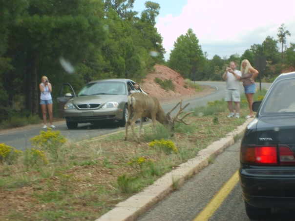 Parked on the roadway and out of their cars, people take pictures of a medium statured white-tail buck.