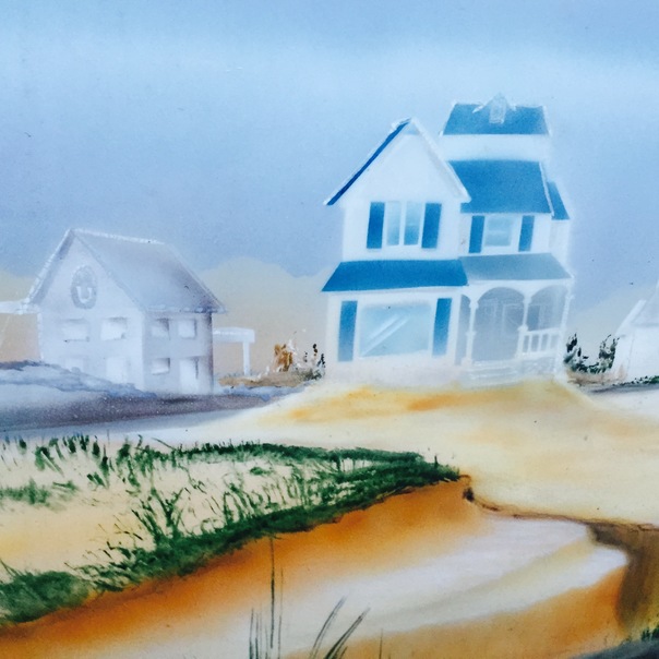 A tall, blue and white colored, two story, Colonial style home sits next door to a smaller, white colored, one story home, behind a patch of tan colored earth with patches of green grass.