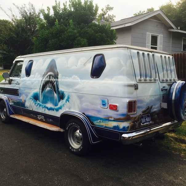 A van with a picture of a shark coming out of the ocean painted along its side.