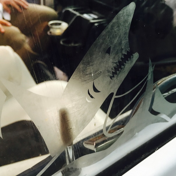 A drawing of a shark is etched into the glass of this establishment.