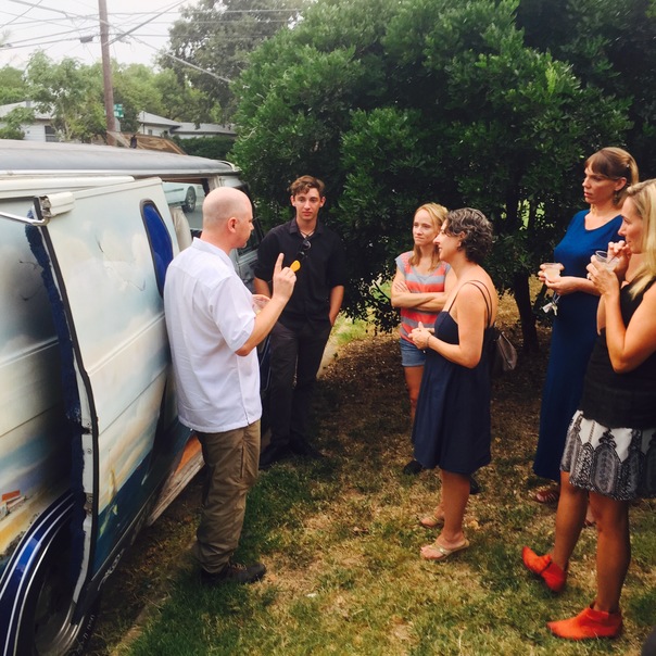 A group of friends outside near their van talking and hanging out.