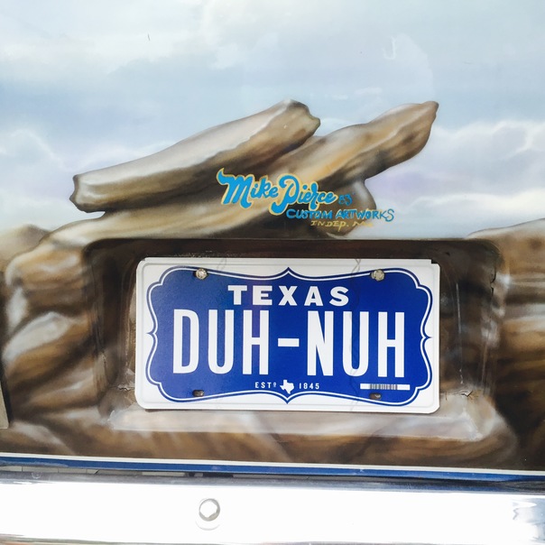 An artistic rendition of a Texas license plate is below the ad.
