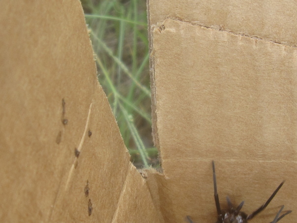 Mainly a photo of cardboard with grass in the background and the glimpse of an insect.