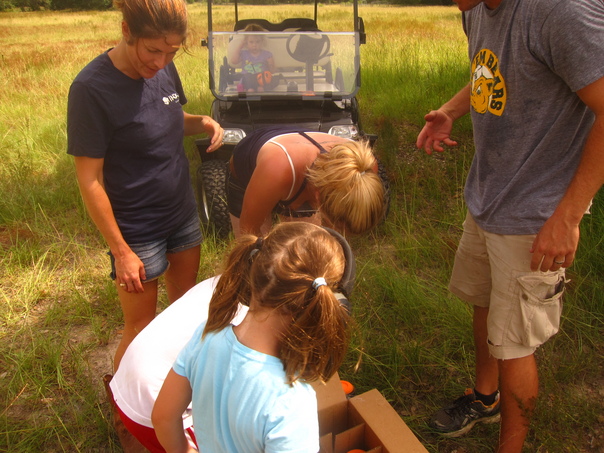 Five people look at the contents of a box in the middle of a field, while in the background a child sits in an ATV.