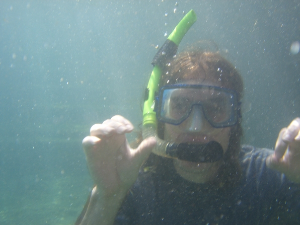 A man snorkeling underwater, with his hands making a sort of gesture.