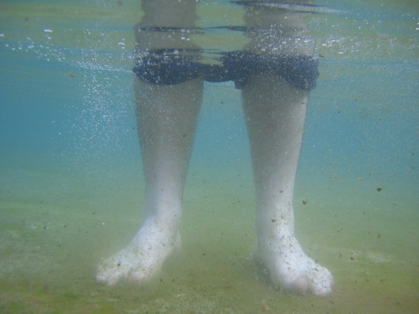 A pair of feet rest of the green and murky bottom of what appears to be a lake, stirring up earth and muck.