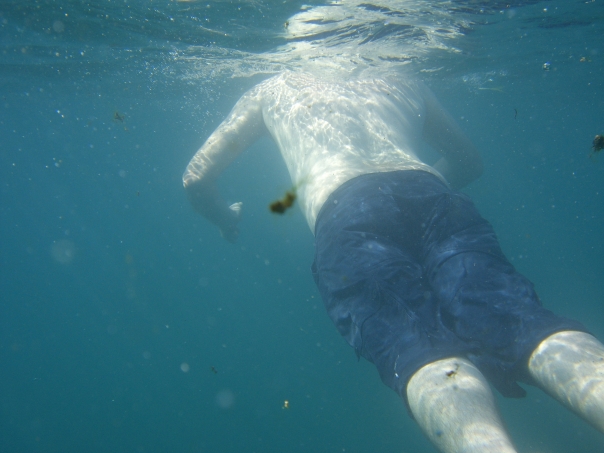 a rear view of a man swimming in the water wearing blue swimming trunks.