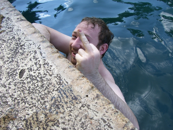 humorless swimmer making obscene gestures