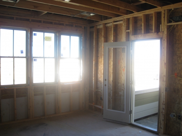 Looking into a house under construction, a glass door is open and sunlight shines through, wood is exposed.