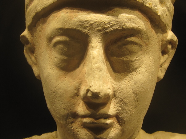 An ancient stone sculpture shows shallow pitting and chipping around the face.