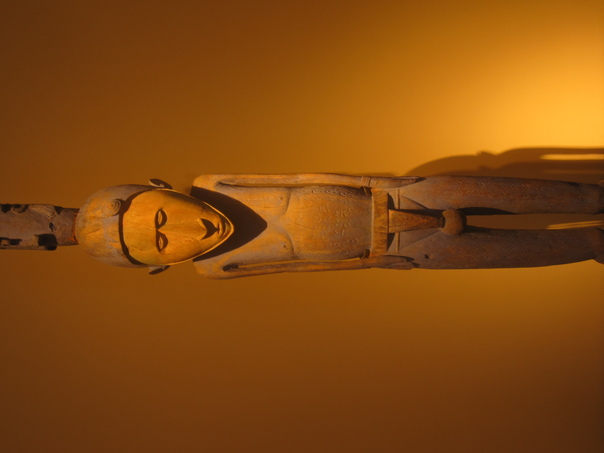Slender yellow wooden statue of Aboriginal tribesman with sad face