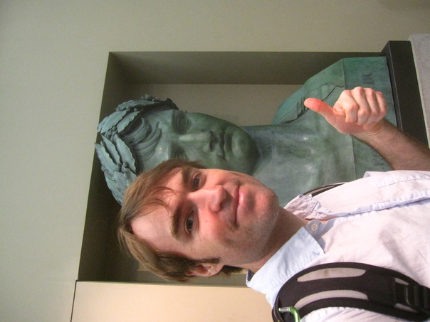 This is a picture of a man in a light colored shirt next to a green statue of himself.
