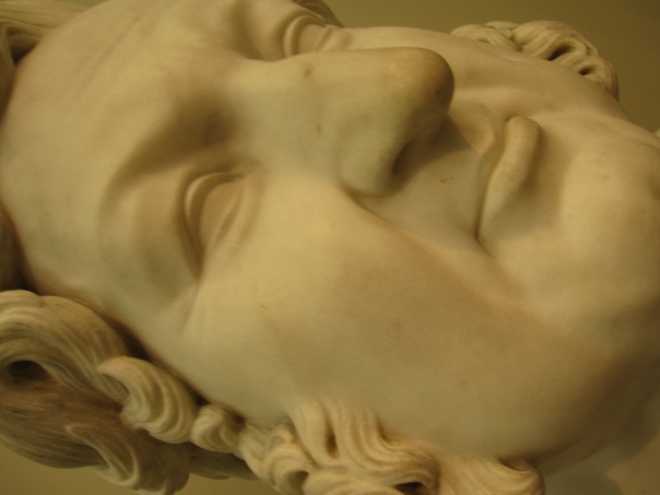 A white stone statue of a male head has profound detail in the carving of the hair and facial details, except for lack of detail in the statue's eyes.