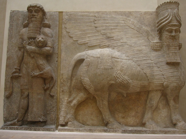 Two relief carvings, each depicting a bearded figure. On the left, a man is holding a four-legged animal in his left arm, and an implement in his right. In the other carving, a bearded face is attached to the body of a winged lion.