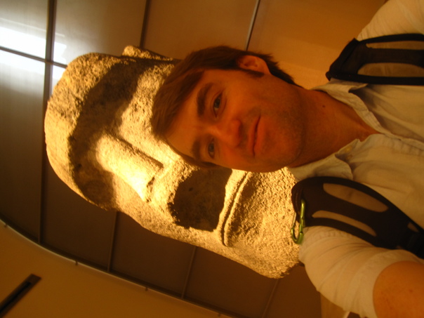 A man wearing a backpack takes a selfie with an Easter Island statue.