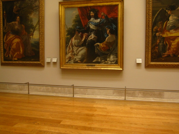 Three eighteenth century paintings are hanging in an art museum under bright lights.