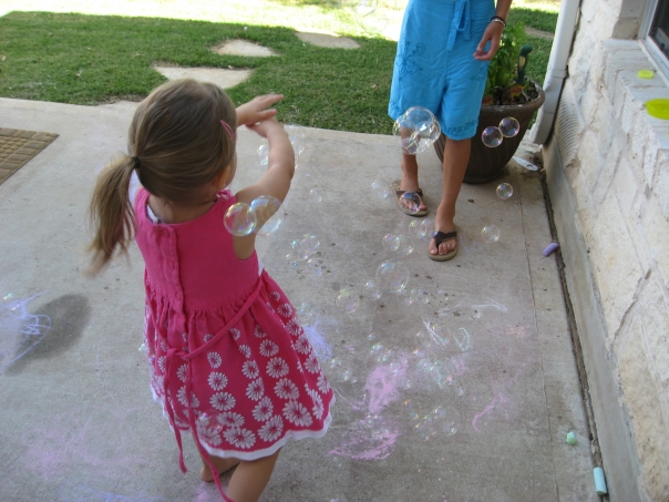 There is a little girl in a pink dress with white flowers playing with bubbles that are in the air.