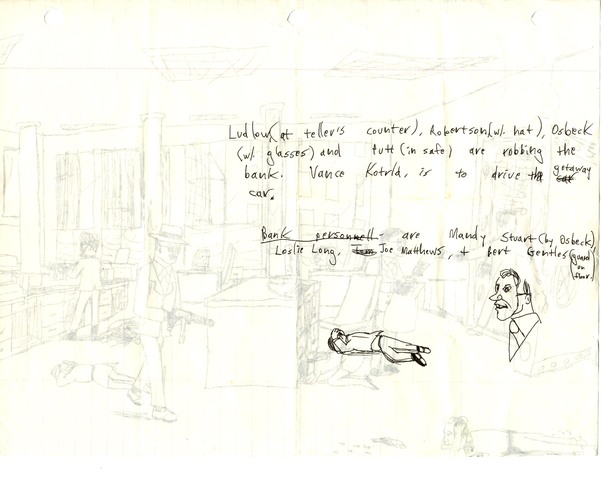 Ludlow (at teller's counter), Robertson (w/ hat), Osbeck (w/ glasses), and Putt (in safe) are robbing the bank. Vance Kotrla is to drive the getaway car.