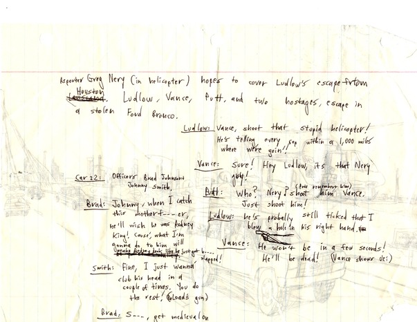 Reporter Greg Nery (in helicopter) hopes to cover Ludlow's escape from Houston. Ludlow, Vance, Putt, and two hostages escape in a stolen Ford Bronco.
