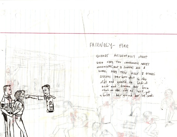 Guards accidentally shoot Greg Nery, two cameramen, Nery's soundmixer (next to Deanna) and a guard. Nery then kills 2 guards. Ludlow has been shot in the side and grazed on the back of the neck and Deanna has been shot on the side as well, yet a bullet has grazed her left cheek.