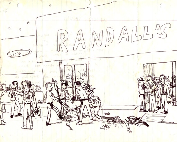 Many years ago while still in high school, I had a friend named Nick Walters. For the life of me, I have no idea how this got started, but he began drawing pictures of my friends and I going on elaborate crime and killing sprees. It wound up turning into this running production whereby he would make me a new drawing every few days and it sort of turned into a series.