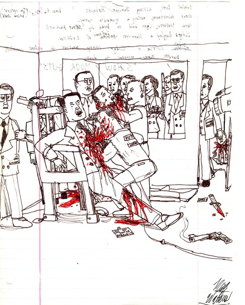 Many years ago while still in high school, I had a friend named Nick Walters. For the life of me, I have no idea how this got started, but he began drawing pictures of my friends and I going on elaborate crime and killing sprees. It wound up turning into this running production whereby he would make me a new drawing every few days and it sort of turned into a series.