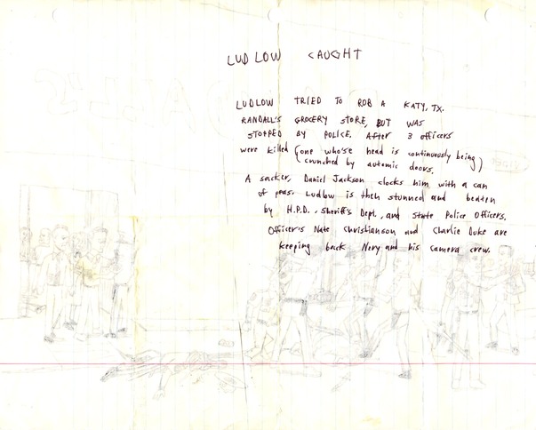 Ludlow tried to rob a Katy, TX Randall's Grocery store, bt was stopped by police. After 3 officers were killed (one whose head is continuously being crunched by automatic doors). A sacker, Daniel Jackson clocks him with a can of peas. Ludlow is then stunned and beaten by H.P.D. Sherriff's Dept., and state police officers. Officer's Nate Christianson and Charlie Duke are keeping back Nery and his camera crew.
