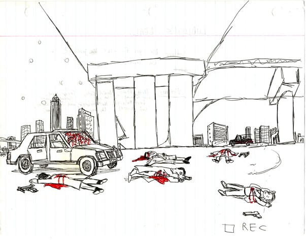 victims: Matt Fitz (next to pistol), Daniel Soto (fat guy), Cesar Vaca (in front of car), Dave Palacio (w/ glasses), Matt Herbert (by car), and John Katz (in car).