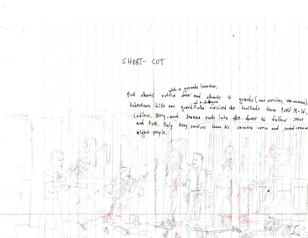 Putt shoots out a door with a grenade launcher and shoots 4 guards (one survives - the woman). Robertson kills one guard with a shotgun who survived the fusillade from Putt's M-16. Ludlow, Nery, and Deanna rush into the doors to follow Steve and Putt. Only Nery survives from his camera crew and sound crew of eight people.