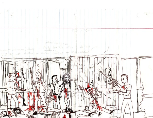 Many years ago while still in high school, I had a friend named Nick Walters. For the life of me, I have no idea how this got started, but he began drawing pictures of my friends and I going on elaborate crime and killing sprees. It wound up turning into this running production whereby he would make me a new drawing every few days and it sort of turned into a series.