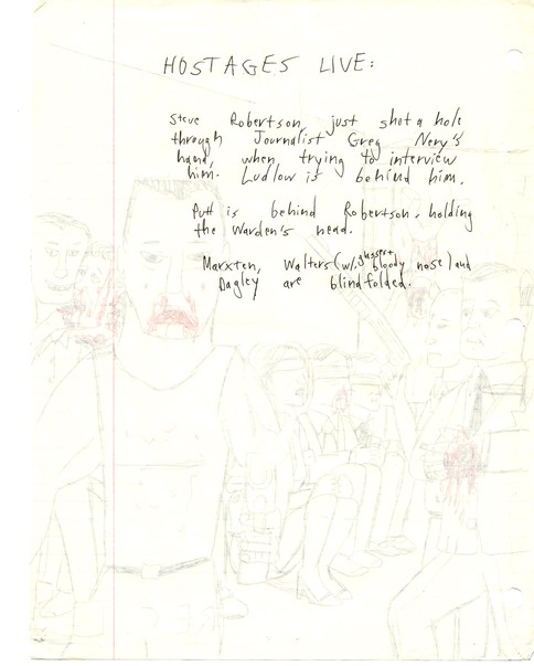 Steve Robertson just shot a hole through journalist Greg Nery's hand when trying to interview him. Ludlow is behind him. Putt is behing Robertson, holding the warden's head. Marxten, Walters (w/ glasses bloody nose) and Dagley are blindfolded.