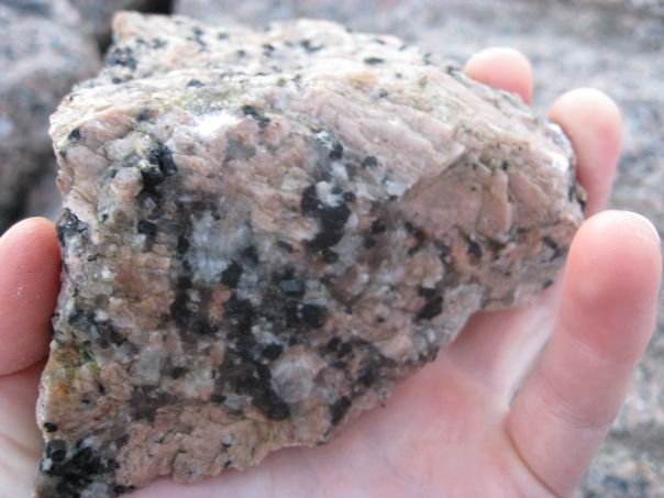 Close-up of a human hand, holding a rock that nearly fills their palm, it contains all kinds of colors, tan, black, white, possible crystals