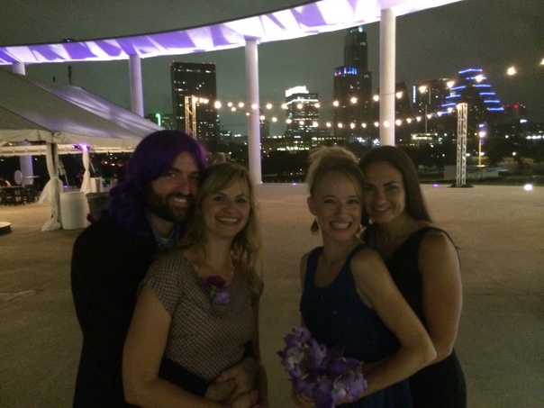Two of the ladies have purple flowers and the man to the left has bright purple hair.