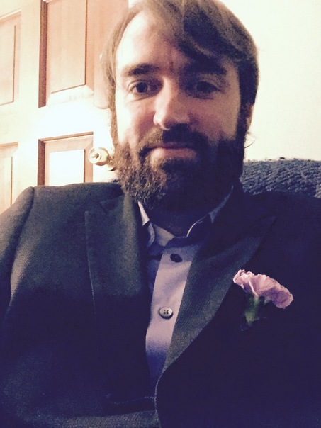 A man with a bard wearing a dark suit with a flower in his lapel.