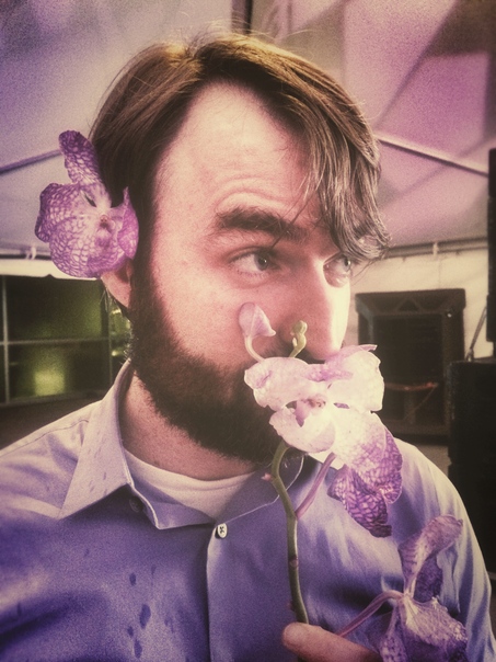 This is a picture of a man with a purple shirt or in a flower and his ear and in his mouth.