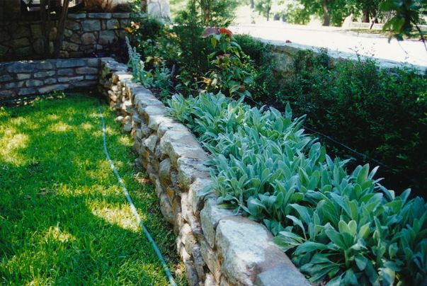There is a picture of a nicely planted garden with a hose nearby in the grass.