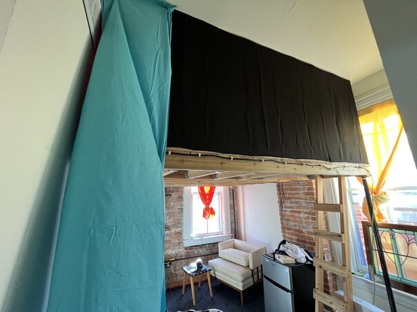 I had already ordered some blackout curtains and so I framed out the top of the loft in the same fashion one would frame out a wall. I ran the wiring into the bed area as necessary, complete with remote controlled switches, and then sealed it shut with the blackout curtains (having to cut them up rather significantly so they'd fit).