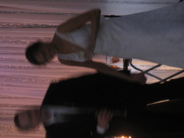 A blurry picture of a bride and groom standing inside a room with a pink curtain behind them.