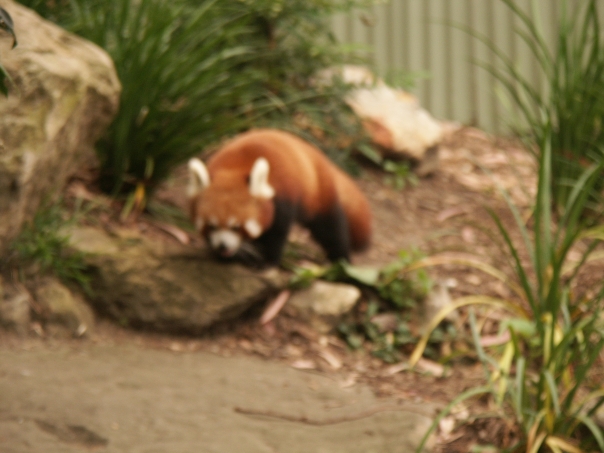 This image is a bit blurry but is an image of a red panda; a creature that resembles a mix between a racoon and a red fox.