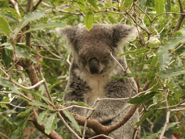 A koala bear perches on small branches in a tree, its eyes barely squinting open.
